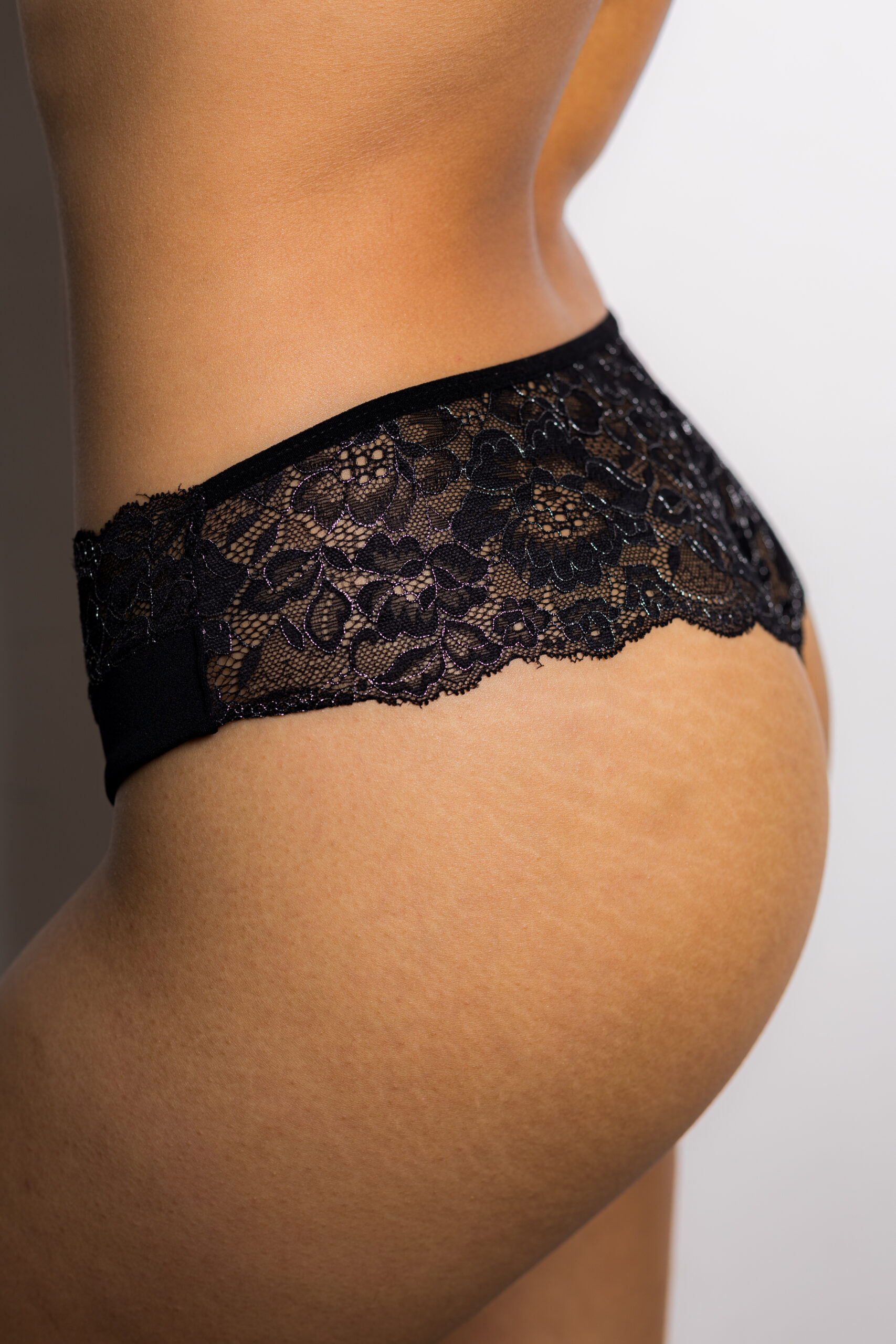 Seducción en cada detalle. Esta panty tipo cheeky combina un panel frontal sólido con un exquisito encaje floral que se extiende hacia los laterales y la parte posterior. Su diseño de tiro bajo y bordes festoneados resalta la silueta con elegancia, mientras que los destellos brillantes en el encaje añaden un toque de lujo nocturno.